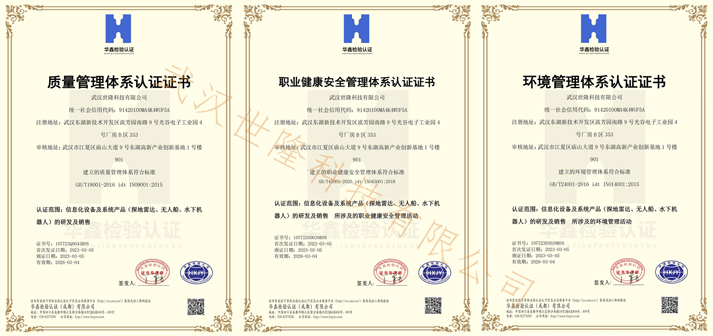 經過質量管理體系評審專家的嚴格審核,武漢世隆科技有限公司順利通過并獲得了由國家市場監督管理總局頒發的“ISO9001質量管理體系認證證書”、“ISO45001職業健康安全管理體系認證證書”和“ISO14001環境管理體系認證證書”,標志著我司在質量體系管理方面走上了新臺階。